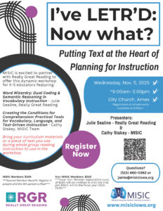 MISIC is excited to partner with Really Great Reading to offer this dynamic workshop for K-5 educators featuring: